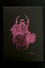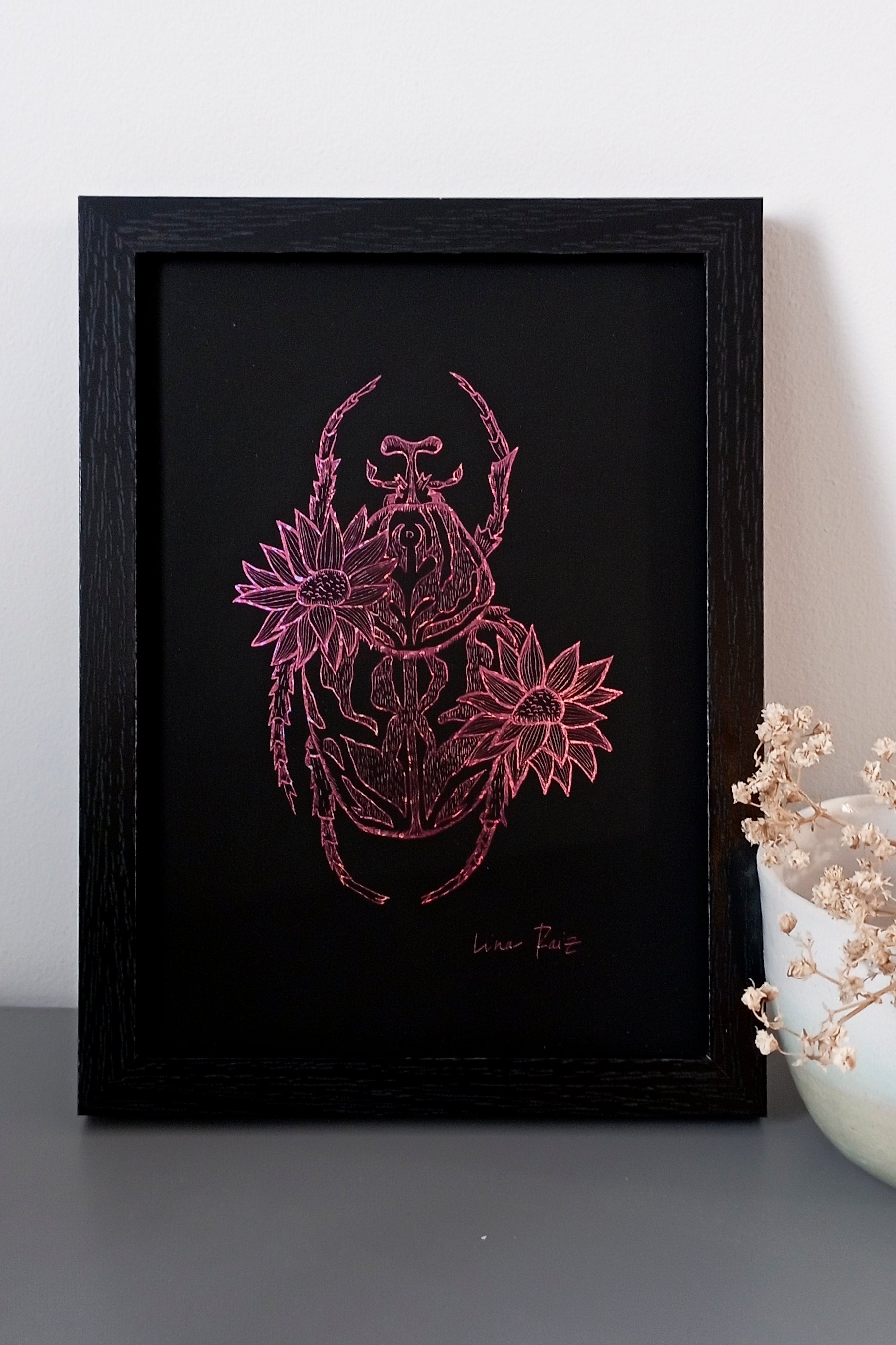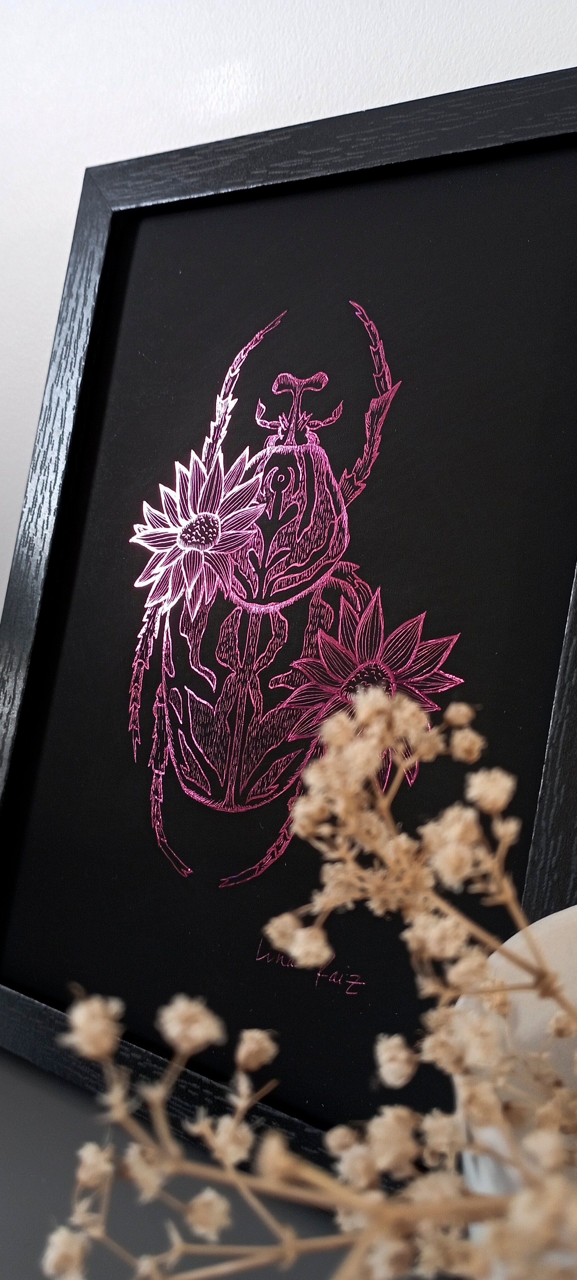 Gravure originale dorée ou argentée sur fond noir, réalisée sur papier à gratter (~100 g). Elle apporte un éclat exceptionnel au dessin avec différents reflets dorés/argentés qui apportent un éclat changeant selon l’angle et la lumière.