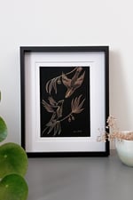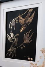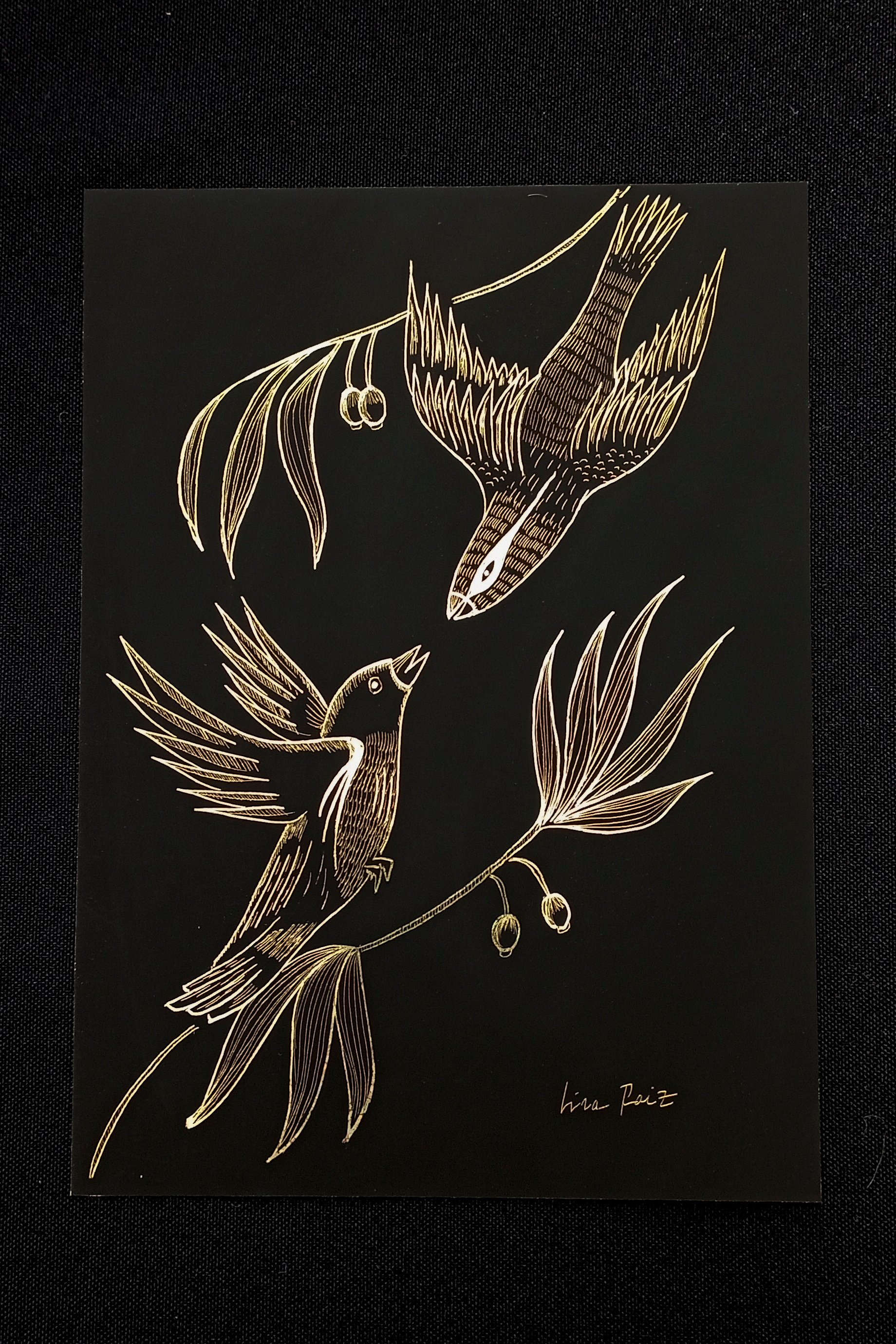 Gravure originale dorée ou argenté sur fond noir, réalisée sur papier à gratter (~100 g). Elle apporte un éclat exceptionnel au dessin avec différents reflets dorés qui apportent un éclat changeant selon l’angle et la lumière.