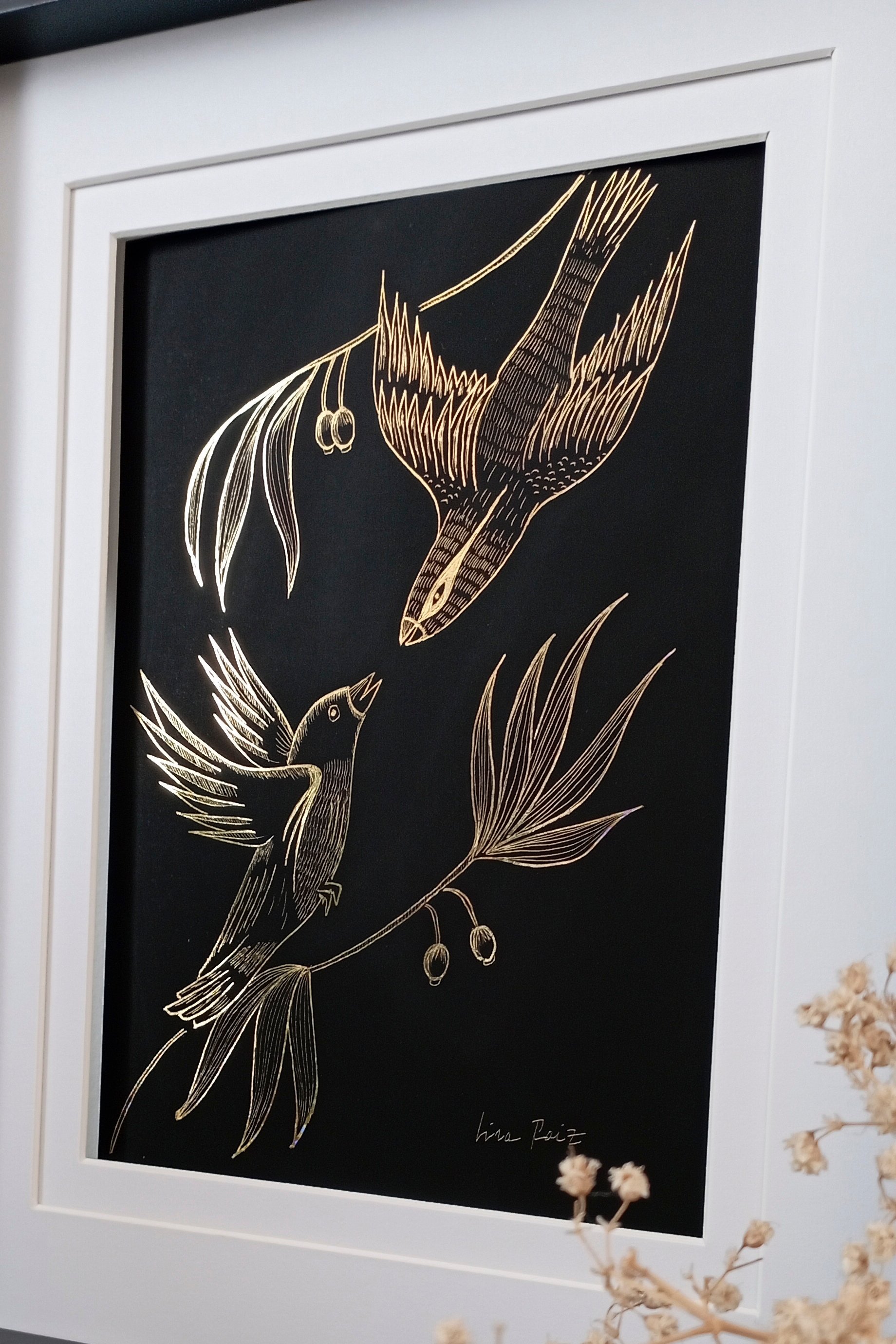 Original gold or silver engraving on a black background, created on a scratch paper (100 g). It brings an exceptional glow to the design, with various golden reflections that shift with the angle and light.