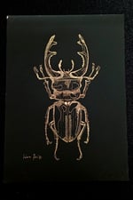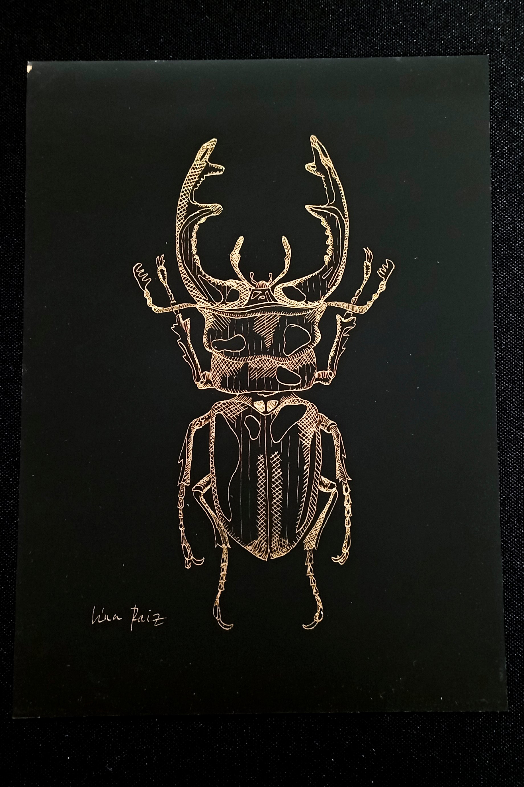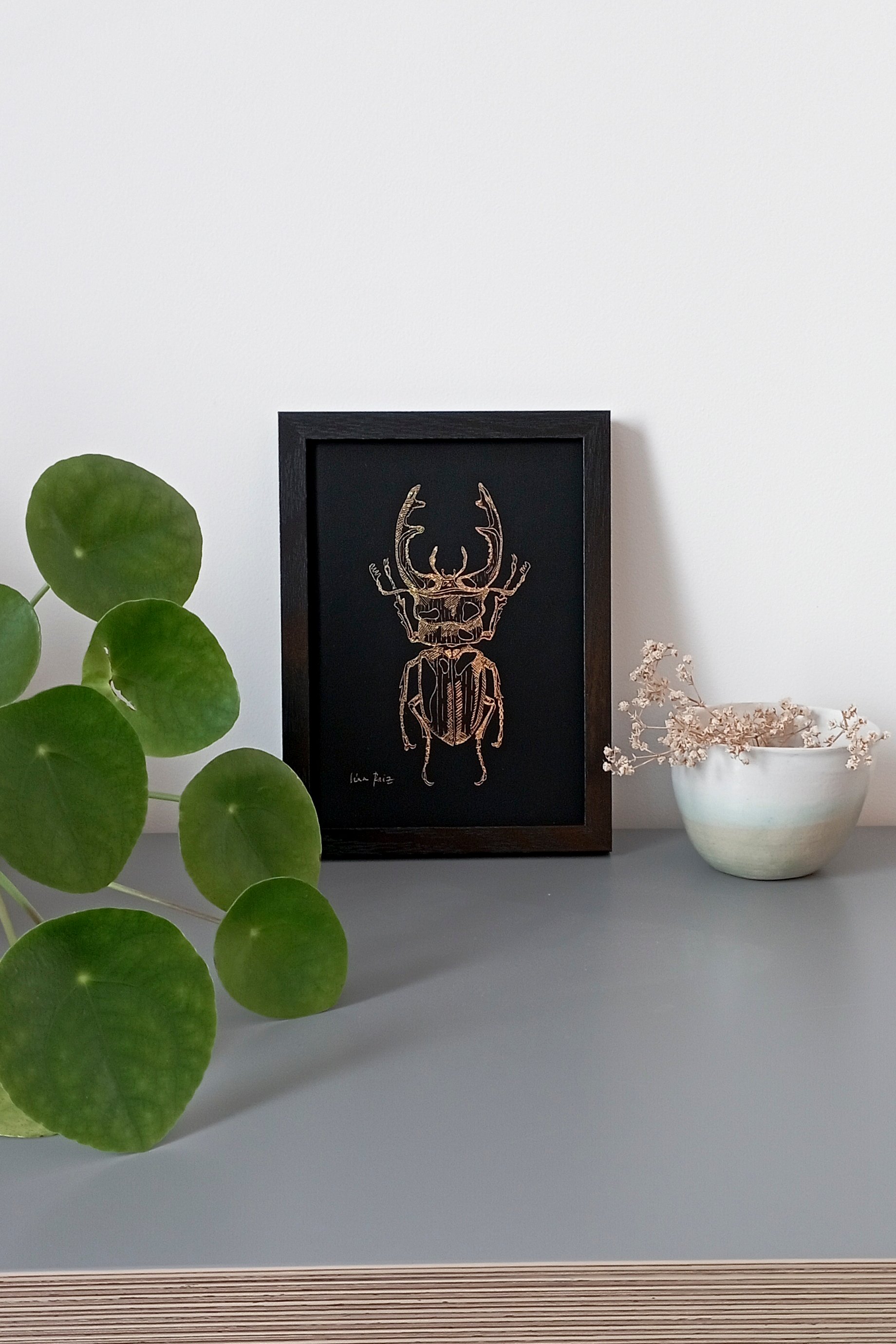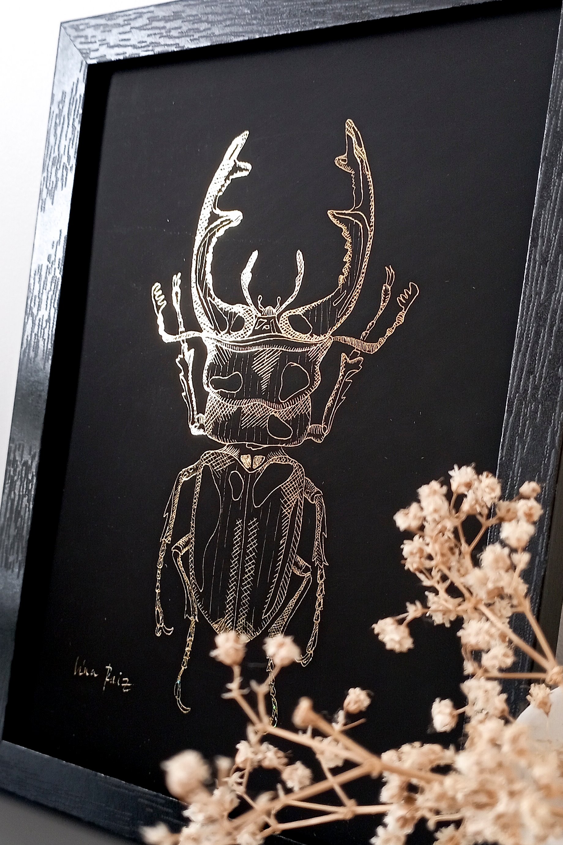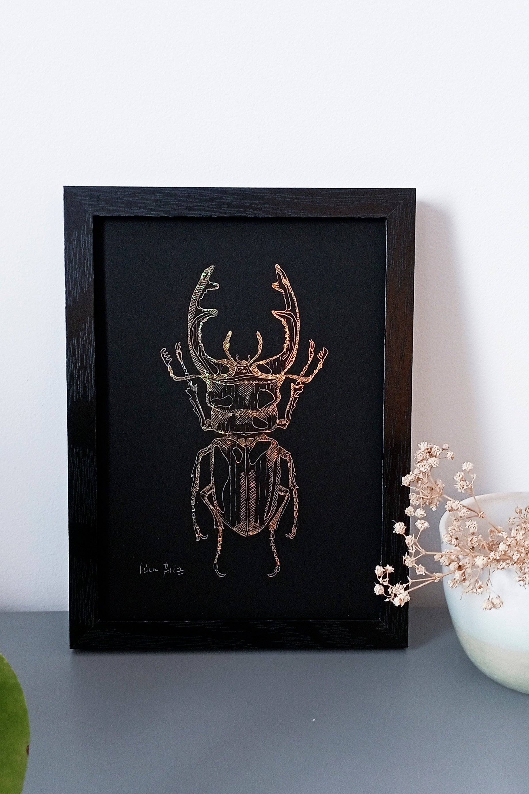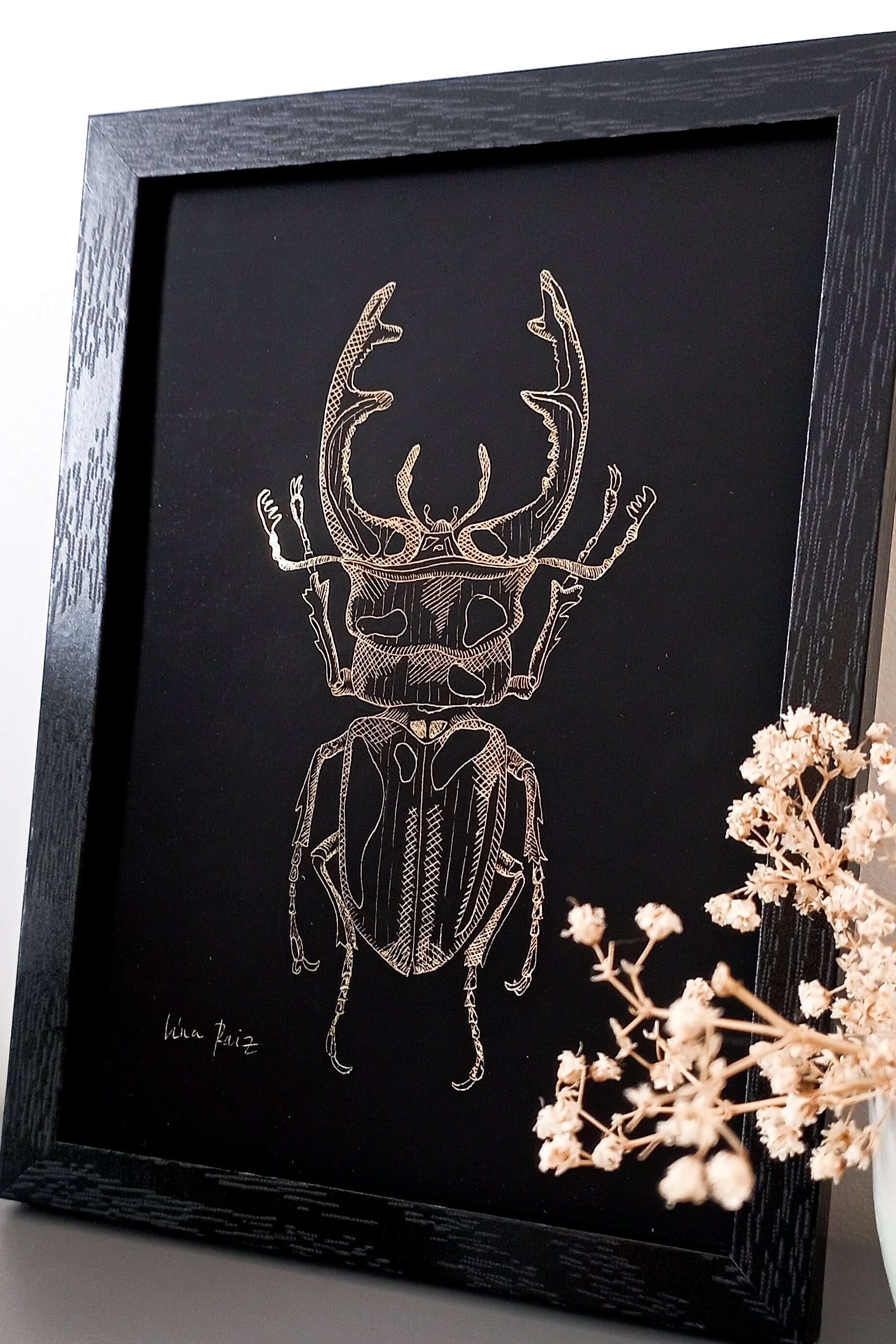 This engraving depicts a stag beetle with its impressive mandibles, rendered with precision and elegance. A symbol of strength, resilience, and transformation, the beetle evokes the quiet power of nature. The lines and textures of the engraving highlight its shiny armor and majestic presence, recalling the delicate balance between protection and freedom in the living world.