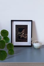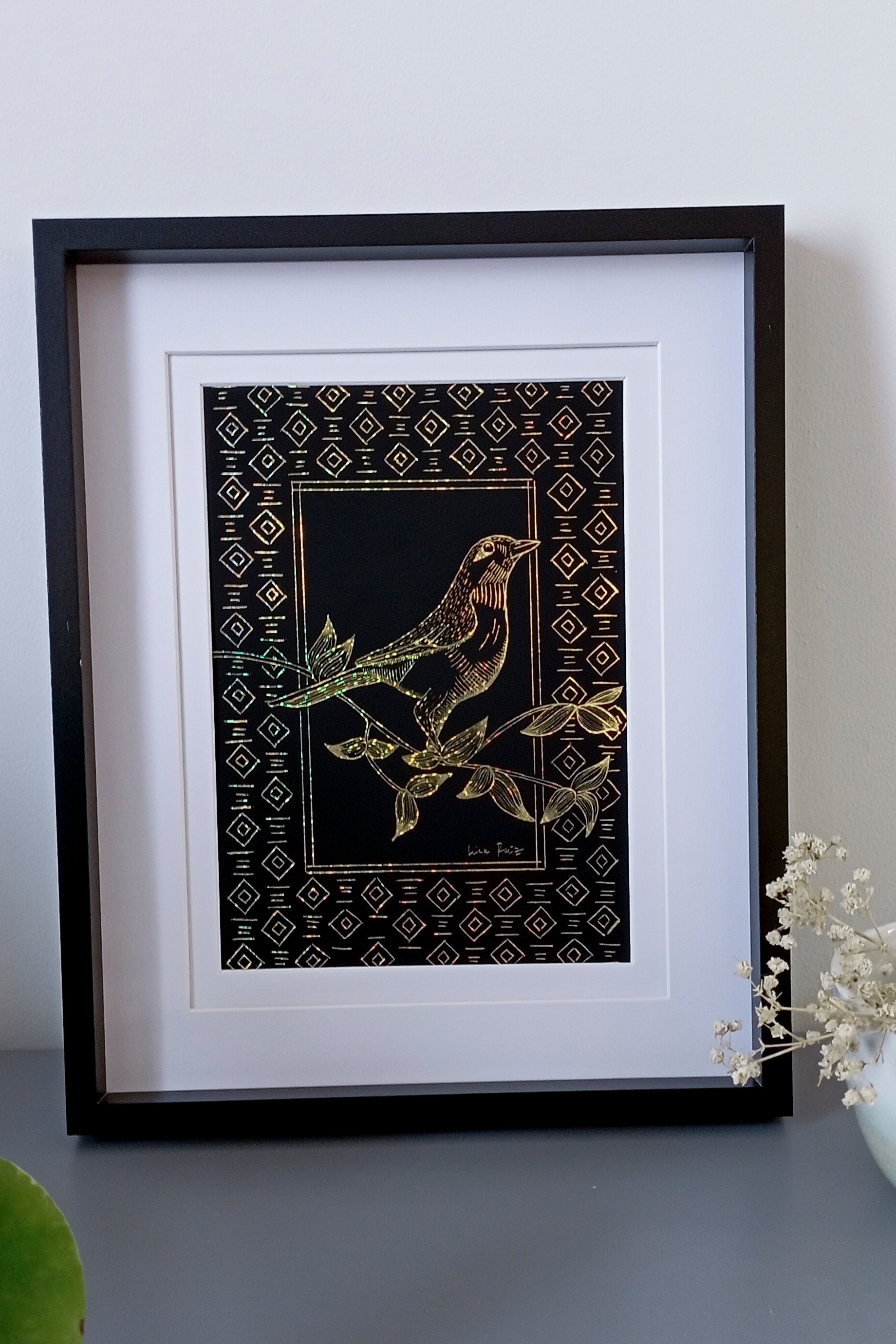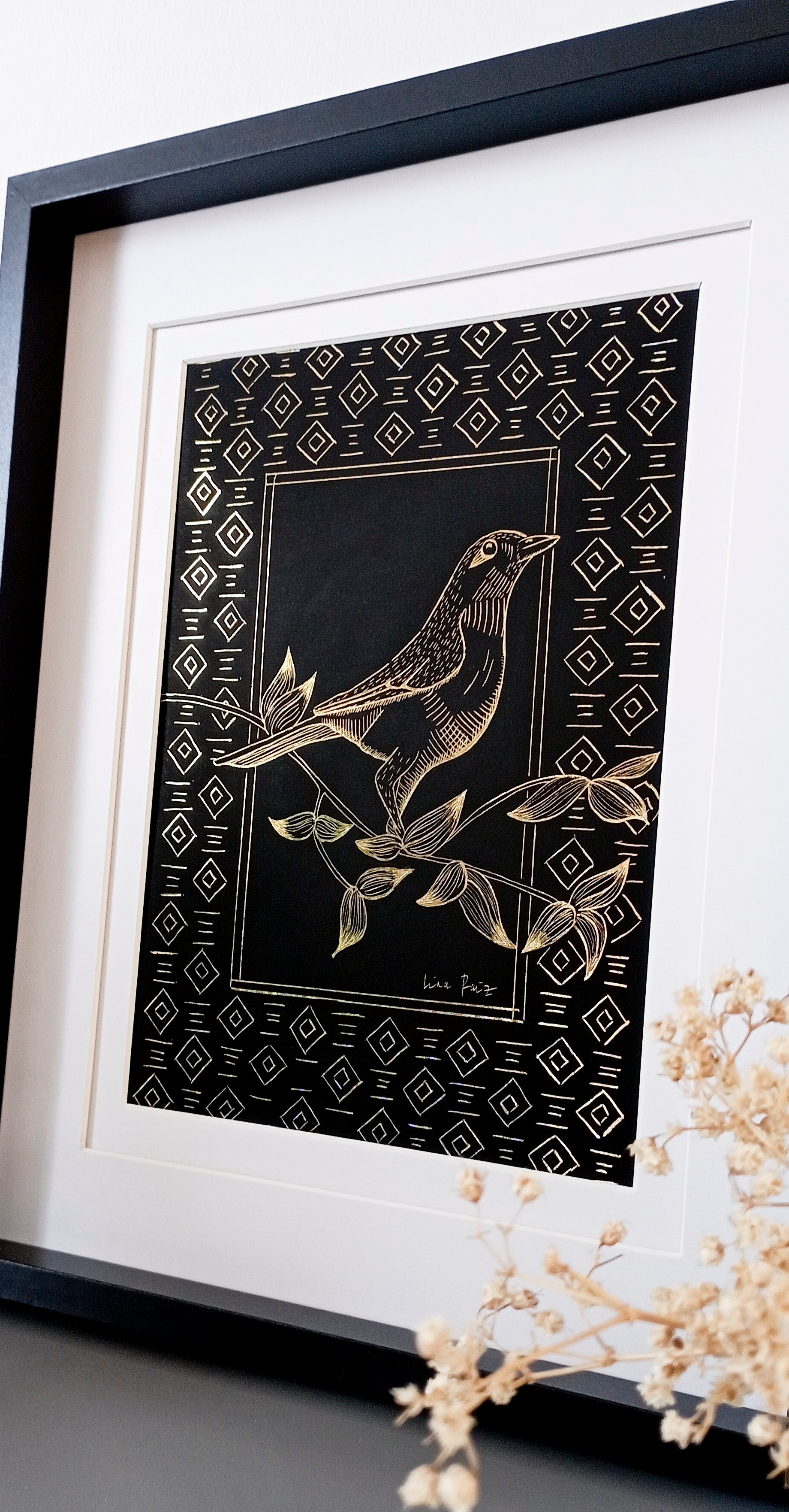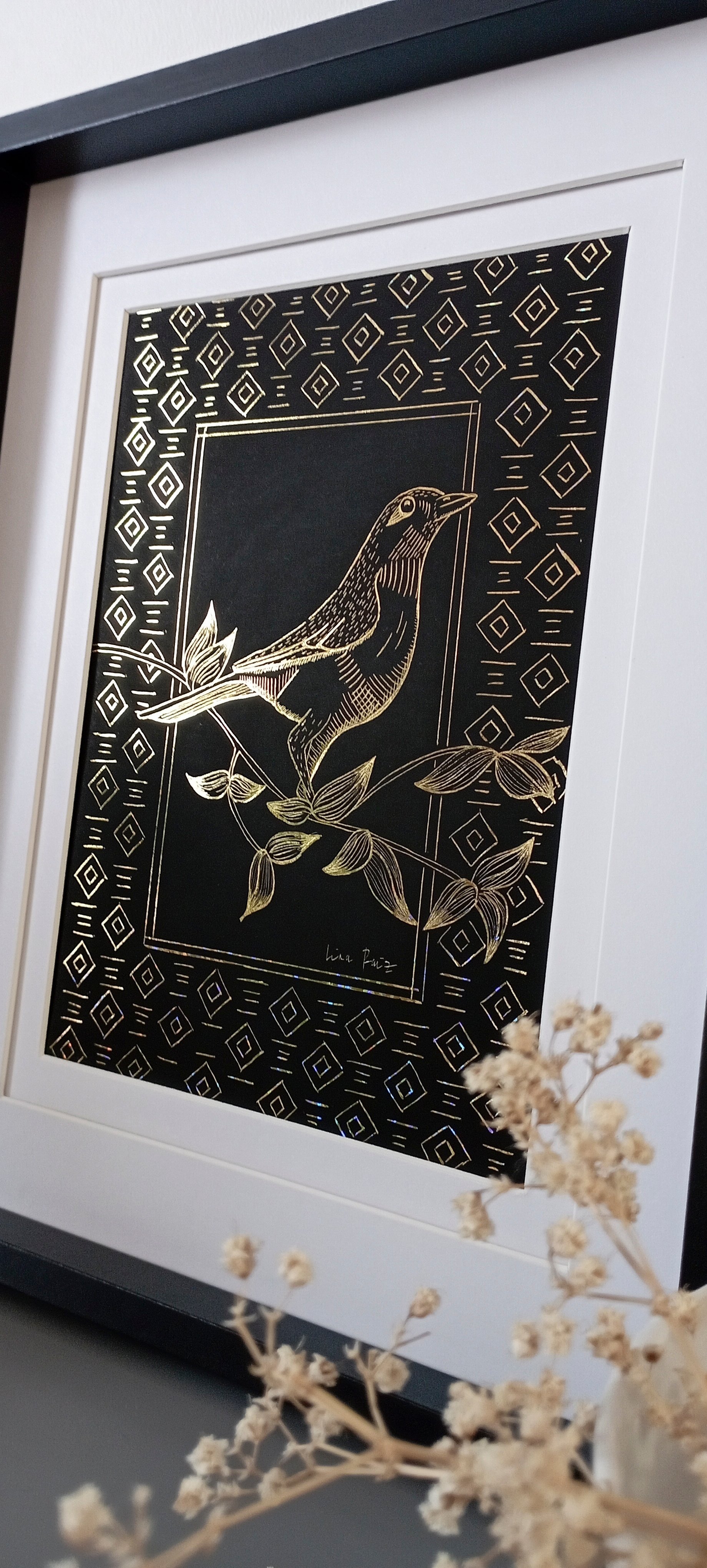 Original gold or silver engraving on a black background, created on a scratch paper (100 g). It brings an exceptional glow to the design, with various golden reflections that shift with the angle and light.