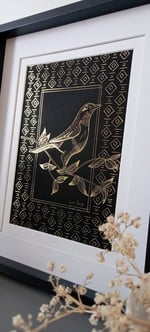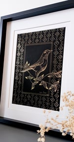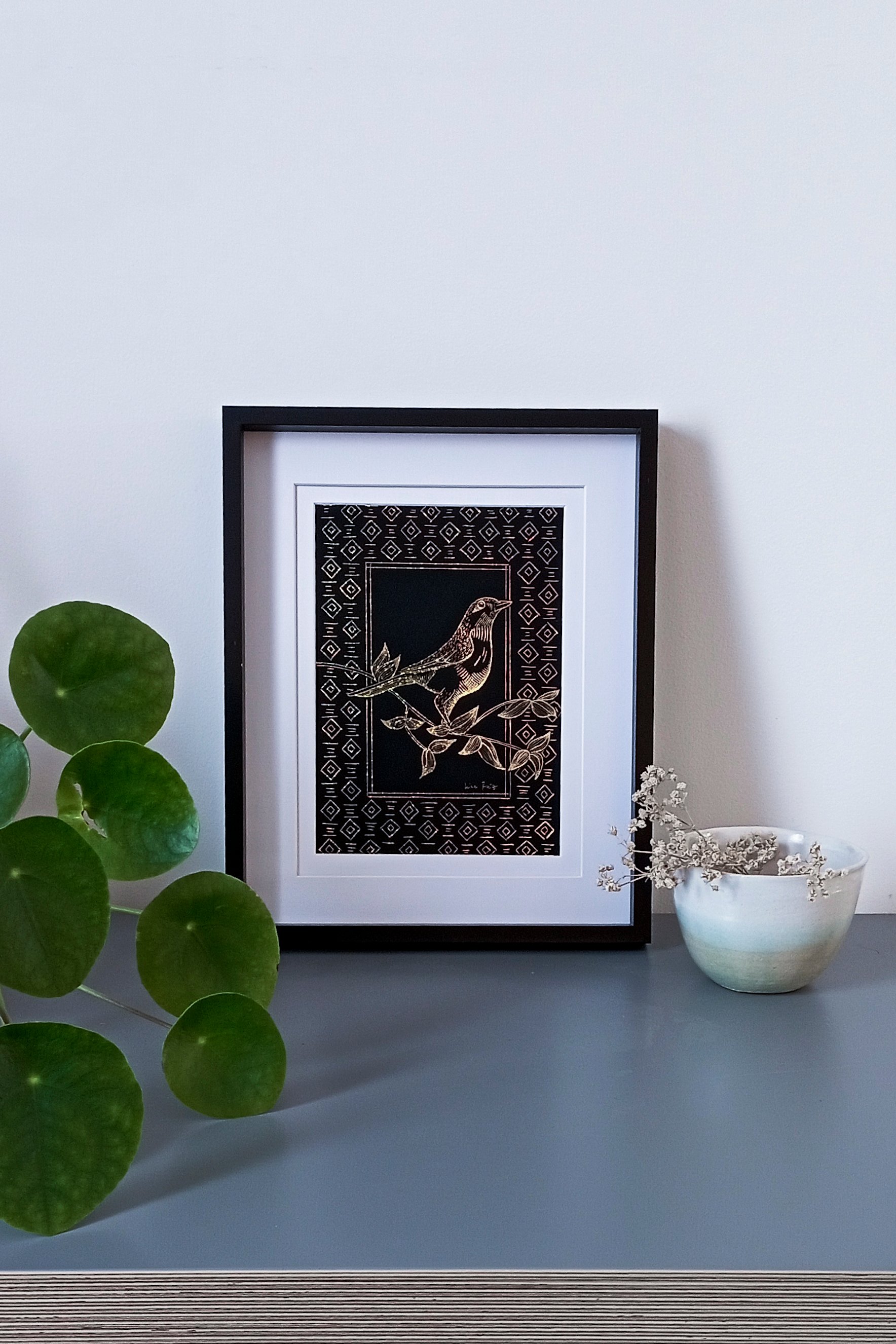 Gravure originale dorée ou argenté sur fond noir, réalisée sur papier à gratter (~100 g). Elle apporte un éclat exceptionnel au dessin avec différents reflets dorés qui apportent un éclat changeant selon l’angle et la lumière.