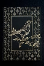 This engraving depicts a blackbird surrounded by stylized African motifs. Inspired by the song Minha Sabia, it evokes the memory, wisdom, and cleverness inherent to capoeira. Every detail reflects the connection between Afro-Brazilian tradition and bodily expression, where song and play respond to one another, and the bird becomes a messenger of stories and teachings passed down through generations.