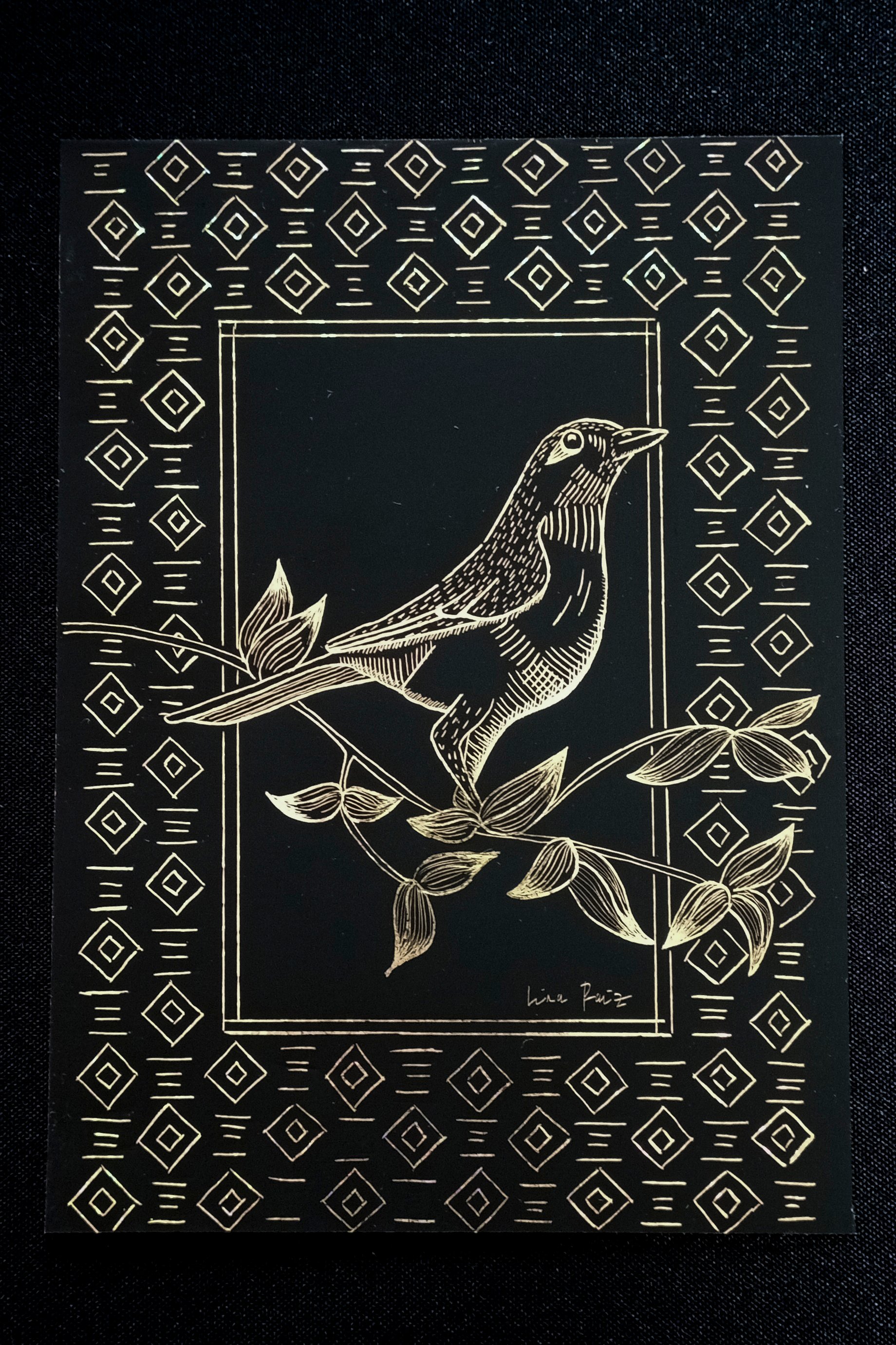 Cette gravure représente un merle entouré de motifs africains stylisés. Inspirée par la chanson Minha Sabia, elle évoque la mémoire, la sagesse et la ruse propres à la capoeira. Chaque détail rappelle le lien entre tradition afro-brésilienne et expression corporelle, où le chant et le jeu se répondent, et où l’oiseau devient messager des histoires et des enseignements transmis de génération en génération.