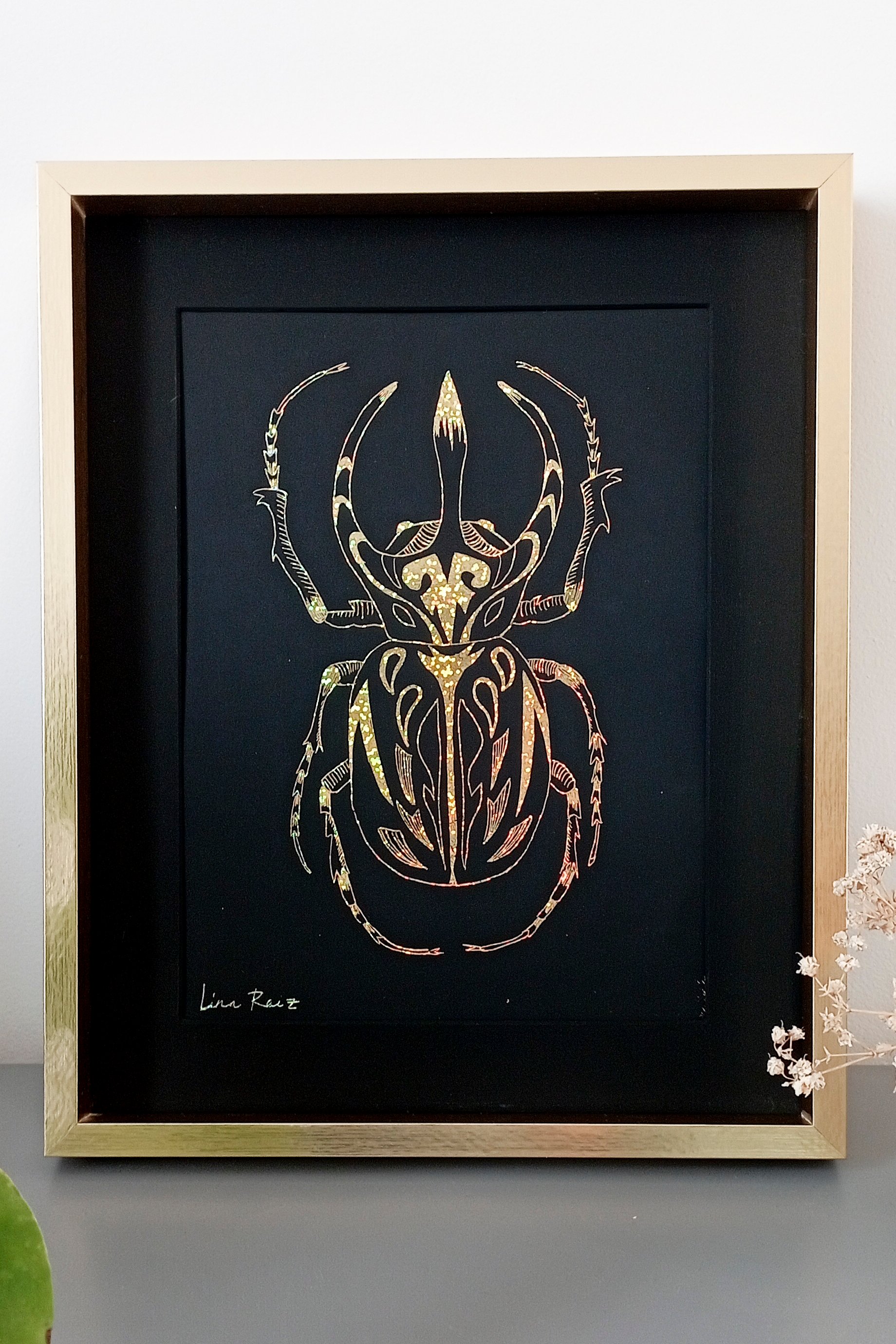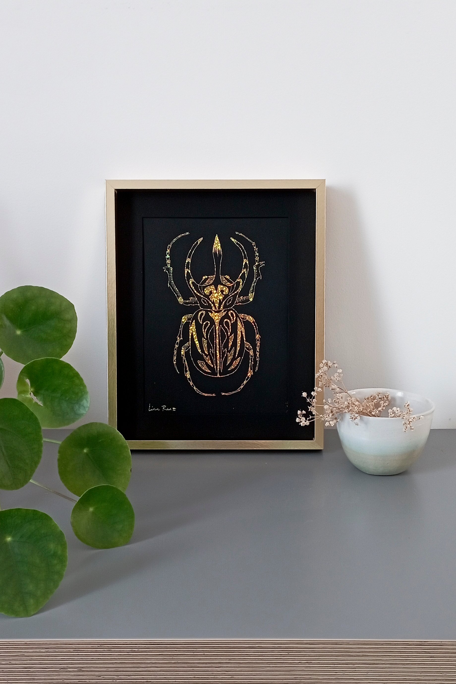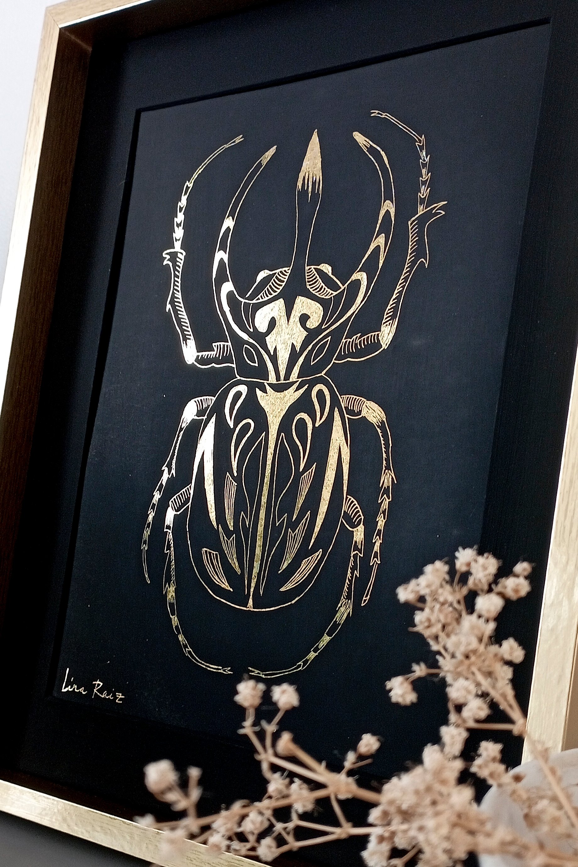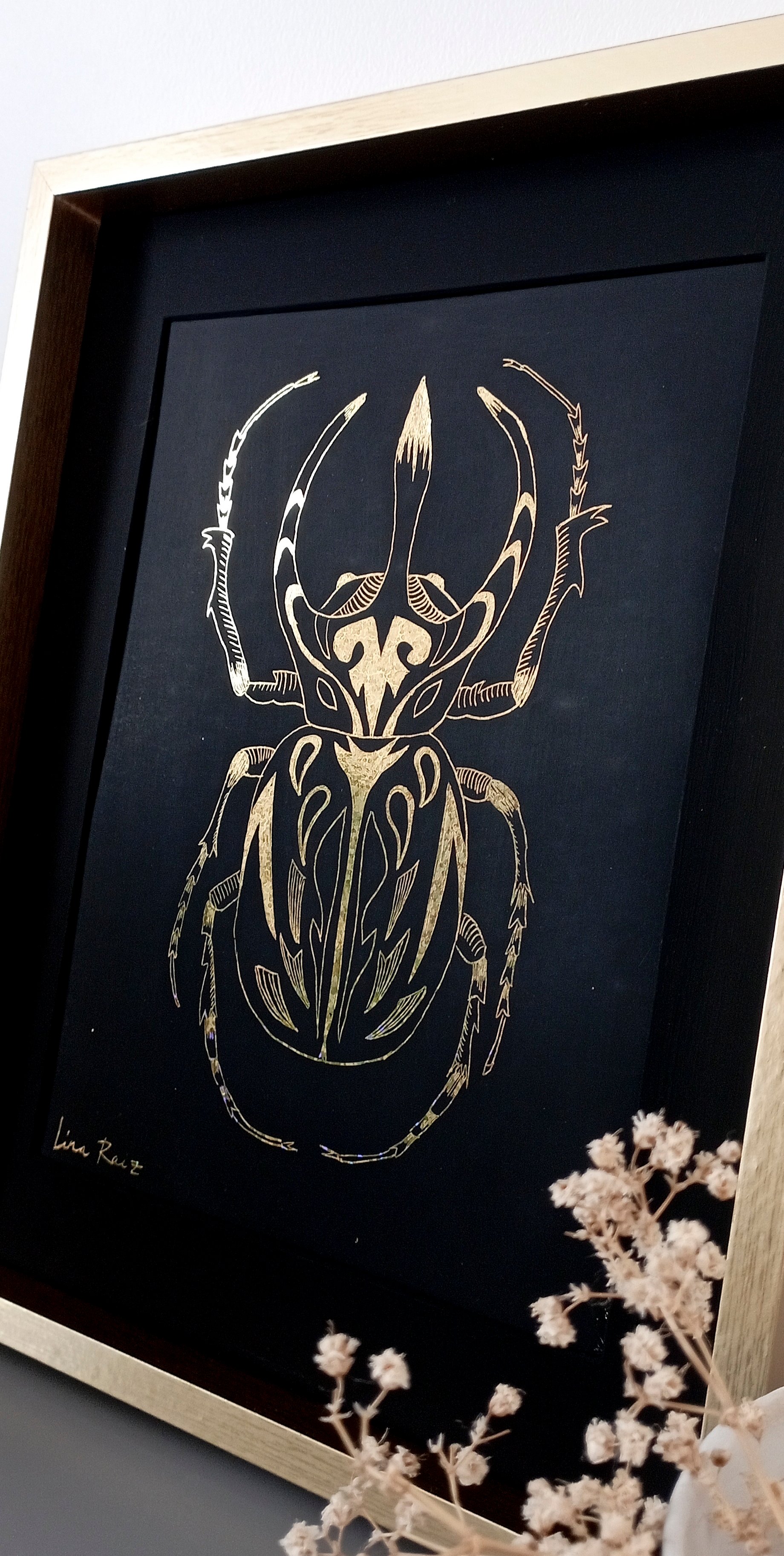 Gravure originale dorée ou argenté sur fond noir, réalisée sur papier à gratter (~100 g). Elle apporte un éclat exceptionnel au dessin avec différents reflets dorés qui apportent un éclat changeant selon l’angle et la lumière.