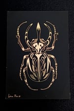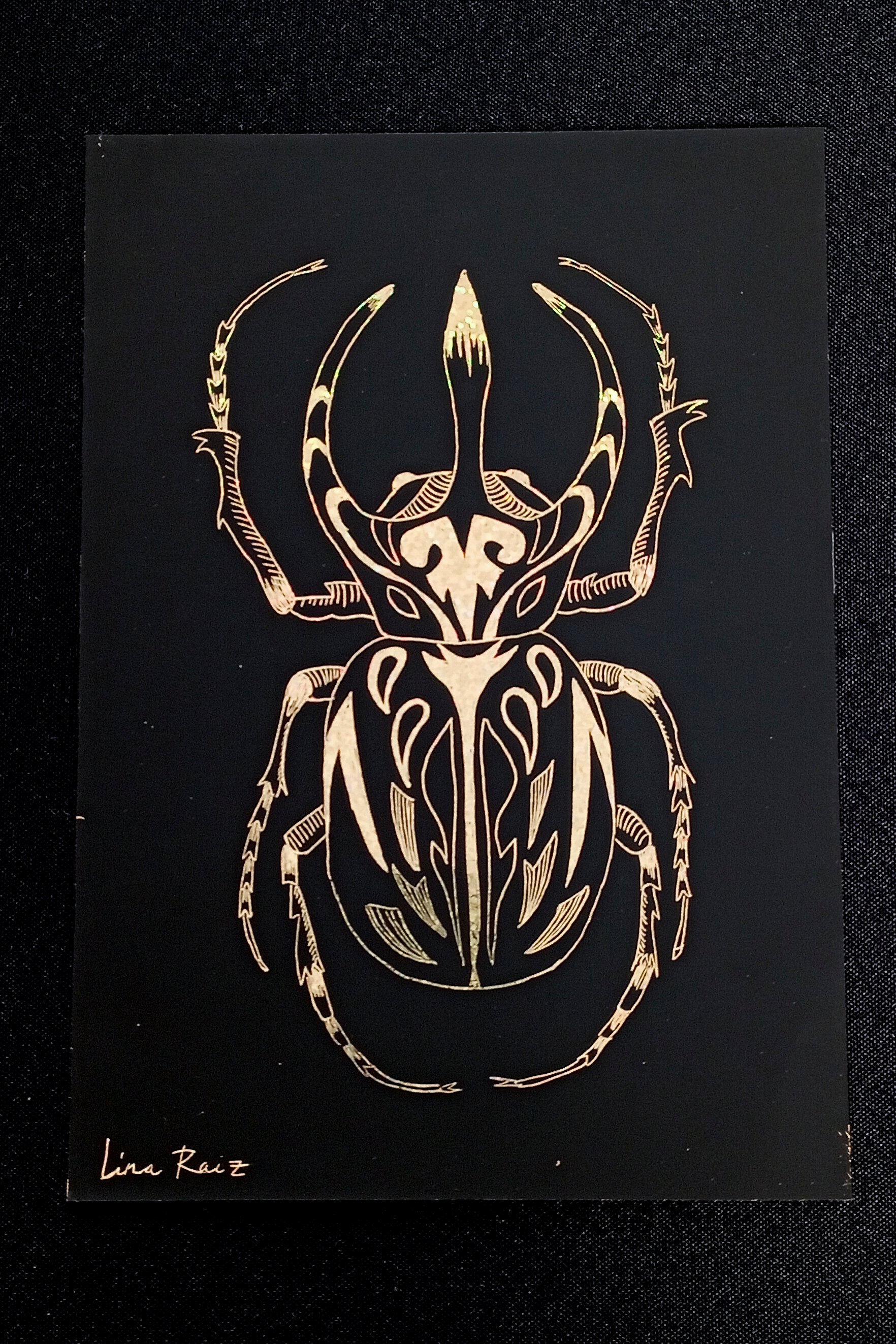Cette gravure représente un scarabée tribal, aux motifs puissants et symétriques, symbole de force et de renaissance. Dans la culture afro-brésilienne et l’univers de la capoeira, il évoque la résilience, l’ancrage et la capacité de transformer l’adversité en mouvement. Comme un gardien terrestre, le scarabée rappelle les racines profondes de cet art, où chaque geste porte la mémoire des peuples et la volonté de se réinventer