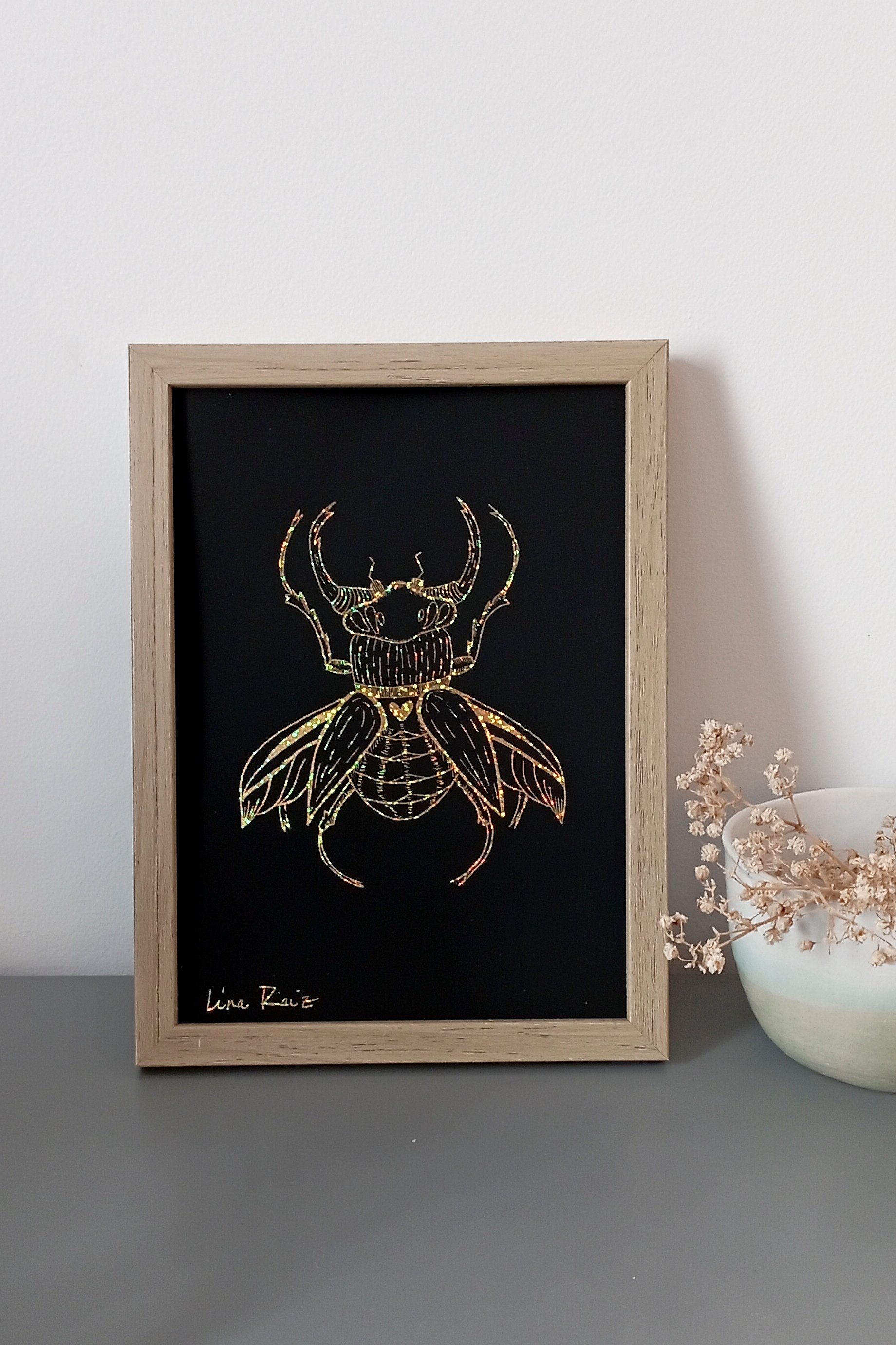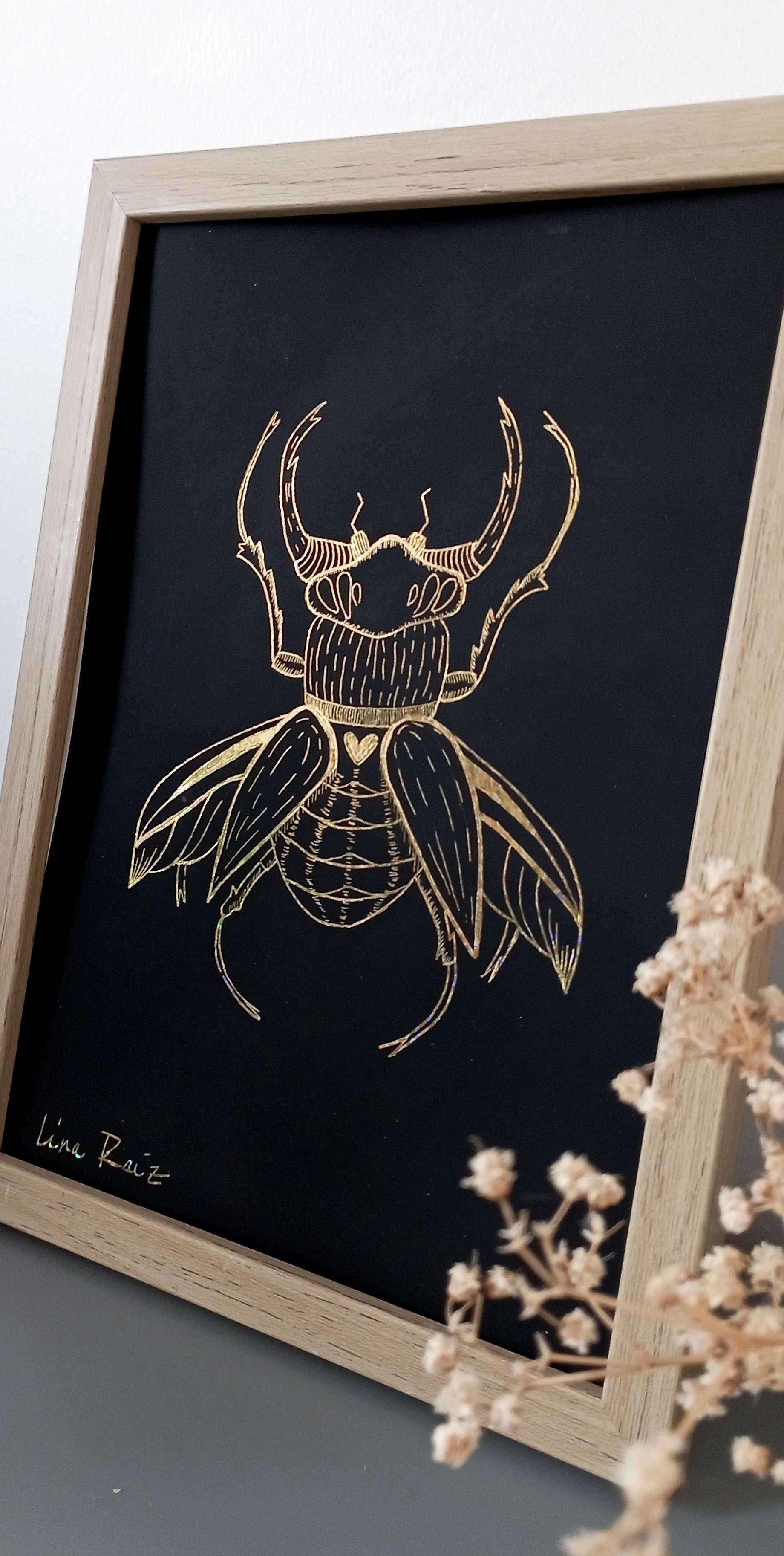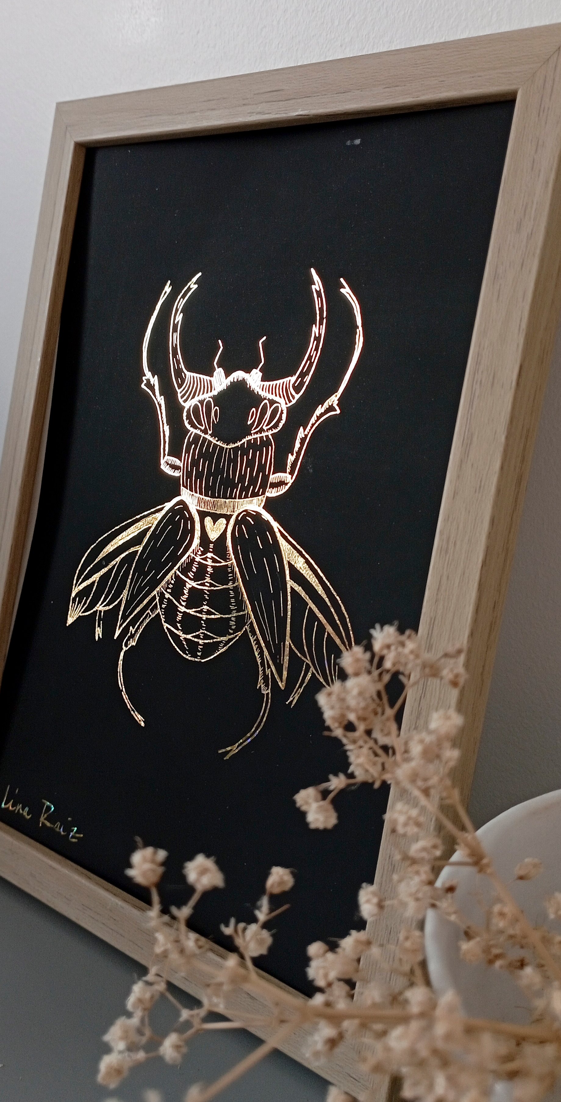 Gravure originale dorée ou argentée sur fond noir, réalisée sur papier à gratter (~100 g). Elle apporte un éclat exceptionnel au dessin avec différents reflets dorés/argentés qui apportent un éclat changeant selon l’angle et la lumière.